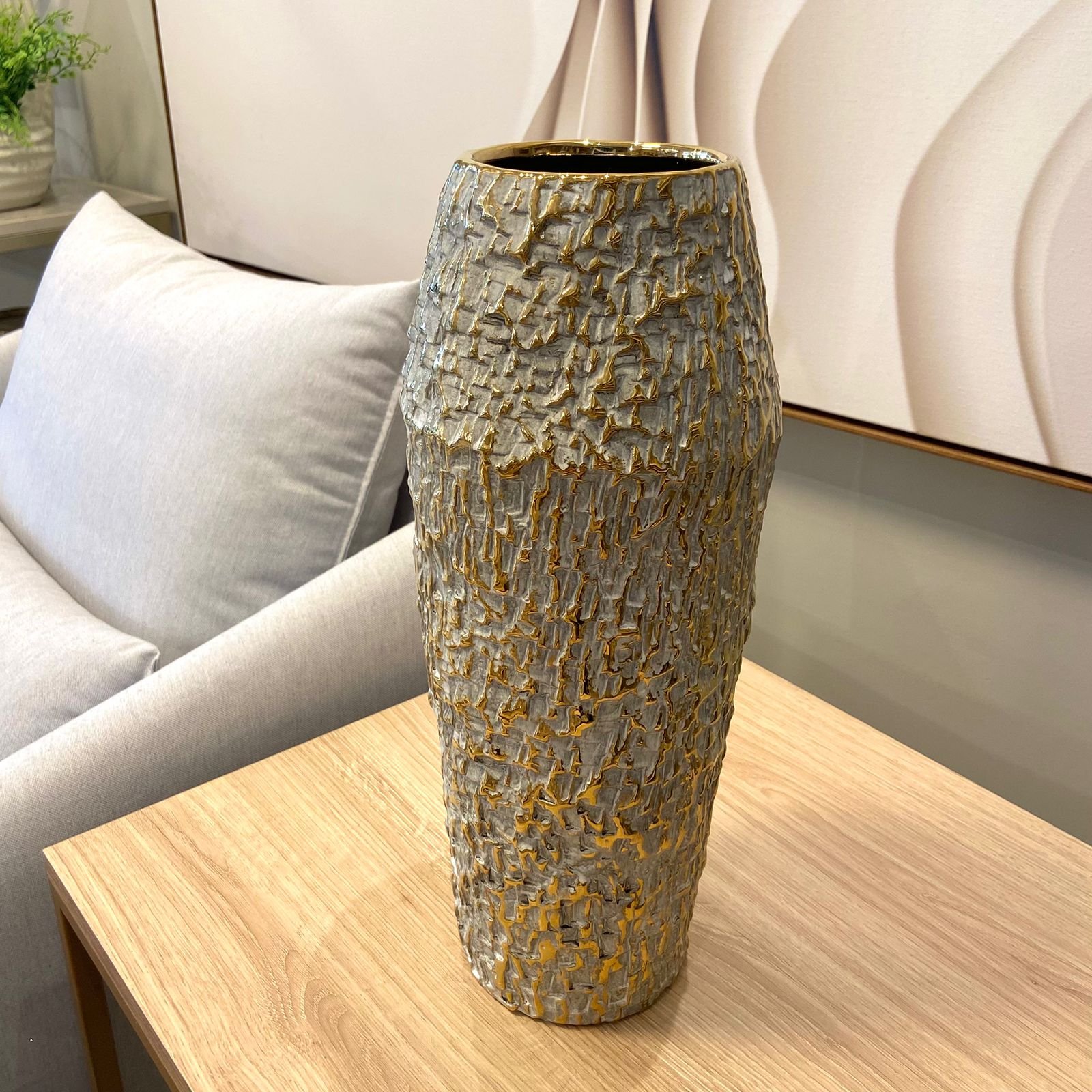 Vasos de metal: Feitos de materiais como bronze, cobre ou alumínio, conferem um toque de elegância e sofisticação à decoração. Podem apresentar detalhes gravados ou relevo.